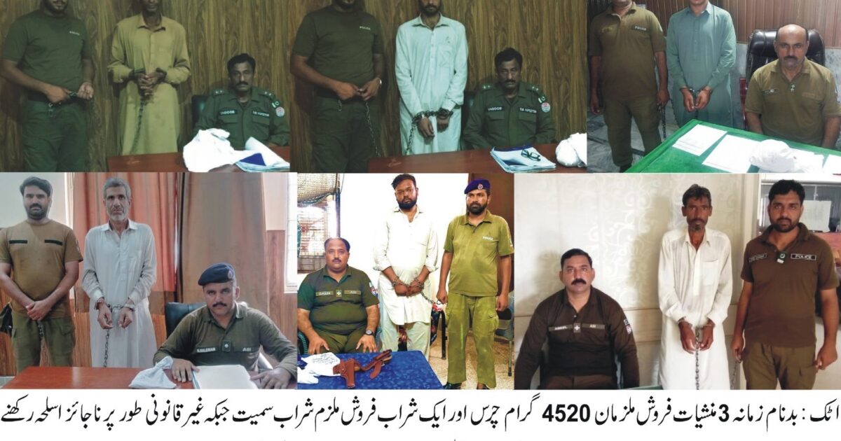 اٹک میں پولیس نے 7 ملزمان گرفتا ر کرکے 5 کلو چرس،33 لیٹر شراب اور 2 پسٹل 30 بور برآمد،