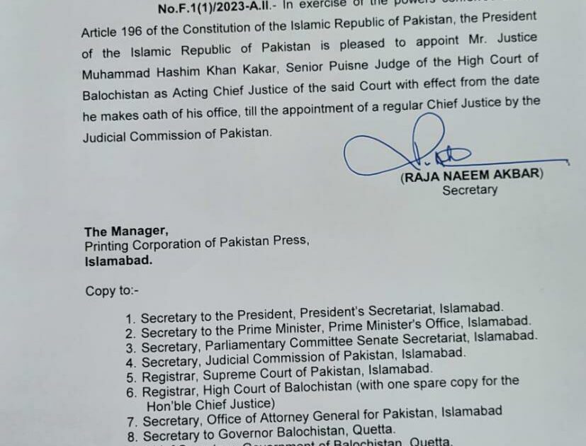 وزارت قانون نے بلوچستان ہائی کورٹ کے لیے سینئر جج محمد ہاشم کاکڑ کا قائم مقام چیف جسٹس کی تقرری کا نوٹیفیکیشن بھی جاری کر دیا