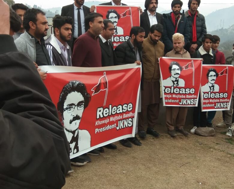 سنٹرل پریس کلب میں ajknsکی طرف سے صدر اے جے کے این ایس ایف مجتبا بانڈے کی رھائی کے لیے احتجاجی مظاہرہ زیرے قیادت ایڈوکیٹ فضل محمود سمت دیگر ظہیر میر سمیت دیگر کی شرکت