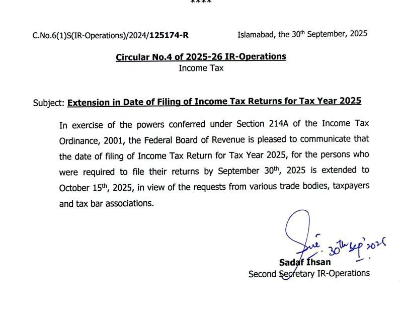 ٹیکس سال 2025 کے انکم ٹیکس گوشوارے جمع کرانے کی تاریخ میں توسیع کا فیصلہ