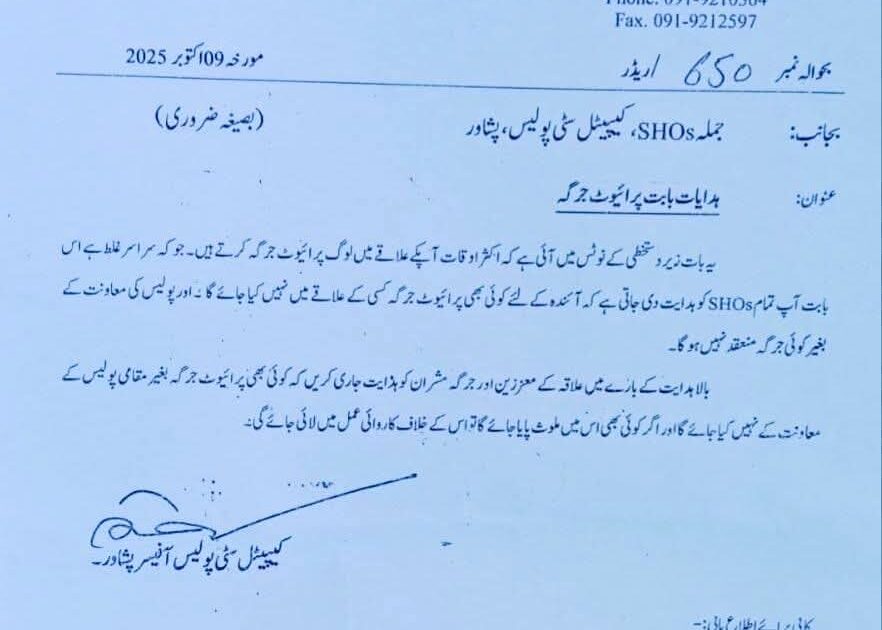 پشاور پولیس کے مطابق سی سی پی او ڈاکٹر میاں سعید نے تمام تھانوں کے ایس ایچ اوز کو ہدایت کی ہے کہ عوامی تنازعات کے حل کے لیے غیر قانونی جرگوں یا ذاتی فیصلوں کے بجائے قانونی و عدالتی راستہ اختیار کیا جائے۔ پولیس افسران کو تاکید کی گئی ہے کہ ایسے عناصر پر کڑی نظر رکھی جائے جو جرگوں کی آڑ میں قانون کو اپنے ہاتھ میں لینے کی کوشش کرتے ہیں۔
