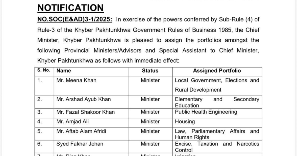 وزیراعلیٰ خیبر پختونخوا محمد سہیل آفریدی کی ہدایت پر صوبائی کابینہ کے محکموں کا باضابطہ اعلامیہ جاری