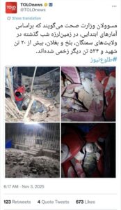 طالبان کی افغانستان میں پاکستانی بمباری سے بچوں سمیت 9 افراد کی ہلاکت کی ذبیح اللہ مجاہد کی جانب سے شئر کی گئی تصاویر کی جعلسازی کو صارفین نے بے نقاب کردیا زلزلہ کی پرانی تصاویر لگا کر اسے بمباری کا نام دے دیا