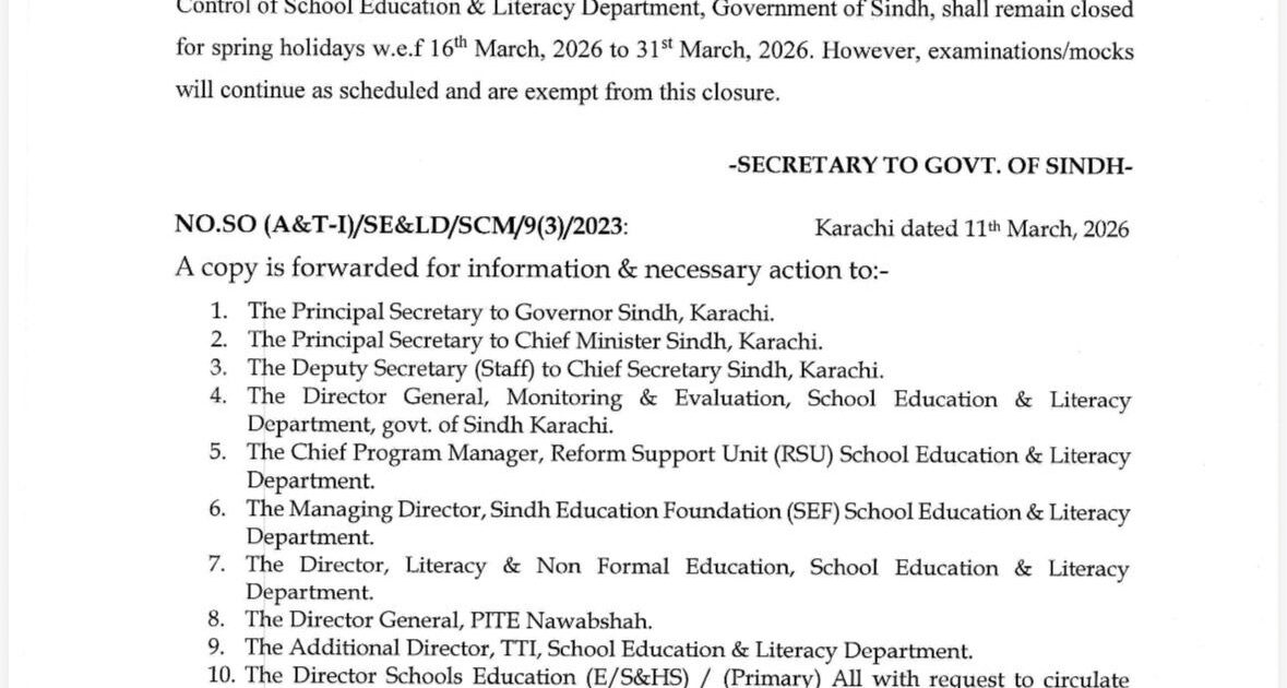 شیئر کریں فیس بک ٹویٹر واٹس ایپ *سندھ کے تمام تعلیمی ادارے 16 تا 31 مارچ تک بند رہیں گے اس حوالے سے سندھ حکومت نے نوٹیفکیشن جاری کر دیا ہے* admin مارچ 11, 2026March 11, 2026 0 تبصرے Post Views: 15 *سندھ کے تمام تعلیمی ادارے 16 تا 31 مارچ تک بند رہیں گے اس حوالے سے سندھ حکومت نے نوٹیفکیشن جاری کر دیا ہے*