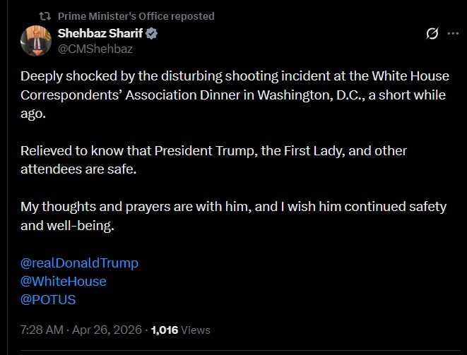 تھوڑی دیر پہلے واشنگٹن ڈی سی میں وائٹ ہاؤس کرسپانڈینٹس ایسوسی ایشن کے عشائیے میں شوٹنگ کے پریشان کن واقعے سے گہرا صدمہ ہوا۔