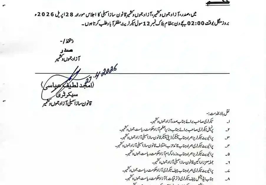 شیئر کریں فیس بک ٹویٹر واٹس ایپ قائم مقام صدر ازاد کشمیر نے اسمبلی کا اجلاس 28 اپریل کو طلب کر لیا نوٹیفکیشن جاری admin اپریل 28, 2026April 28, 2026 0 تبصرے Post Views: 13 قائم مقام صدر ازاد کشمیر نے اسمبلی کا اجلاس 28 اپریل کو طلب کر لیا نوٹیفکیشن جاری