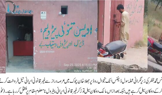 عرصہ دراز سے غیر قانونی ایرانی تیل فروخت کرنے والے تنولی پیٹرولیم پر چھاپہ مار کر وہاں سےبھاری مقدار میں ایرانی تیل برآمد کرکے دوکان موقع پر ہی سیل کردی