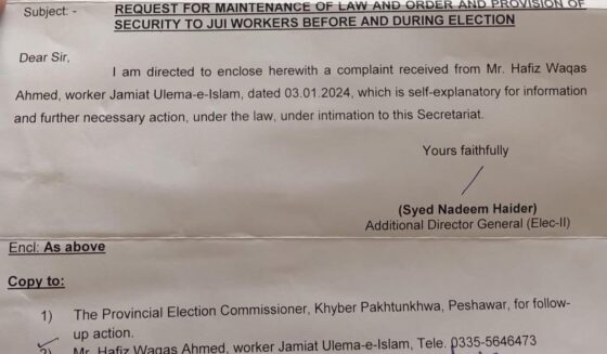 چیف الیکشن کمشنر کی آئی جی پولیس خیبر پختونخواہ کوانتخابی مہم میں جے یوآئی ف کے کارکنوں کو سیکورٹی فراہم کرنے کی ہدایت جاری