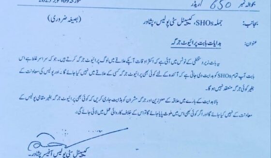 پشاور. چیف کیپیٹل سٹی پولیس آفیسر پشاور ڈاکٹر میاں سعید نے نجی جرگوں کے انعقاد پر مکمل پابندی عائد کرتے ہوئے واضح ہدایات جاری کر دی ہیں کہ آئندہ کسی بھی تھانے کی حدود میں پرائیویٹ جرگہ منعقد کرنے کی…