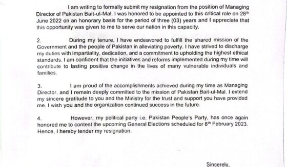 ایم ڈی پاکستان بیت المال عامر فدا پراچہ عہدے سے مستعفی پارٹی قیادت کی ہدایات پر اپنے عہدے سے مستعفی ہو رہا ہوں