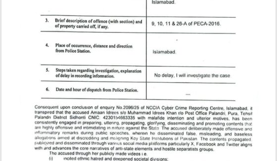 اسلام آباد جوائنٹ ایکشن کمیٹی کے سرگرم رکن سردار امان ادریس کے خلاف سائبر کرائم اسٹیشن میں مقدمہ۔۔ این سی سی آئی اے نے پاکستان مخالف تقریر پر و سوشل میڈیا پر اپ لوڈ کرنے پر پیکا قانون 2016 کی…