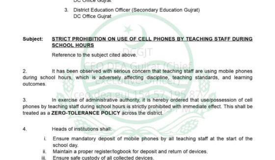 🛑سکول اوقات میں اساتذہ کے موبائل فون پر پابندی، سکول وقت میں لیکچرر ویڈیوز بنانا،یا کسی بھی قسم کی تصاویر بنانے پر سخت کارروائی پیڈا ایکٹ کے تحت ہوگی ۔