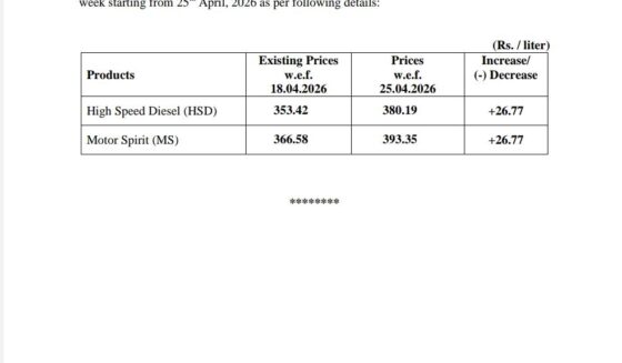 پٹرول اور ڈیزل 26 روپے فی لٹر مہنگا کر دیا گیا وفاقی حکومت کا پیٹرولیم مصنوعات کی قیمتوں میں اضافے کا فیصلہ پیٹرول اور ڈیزل کی قیمت میں 26 روپے 77 پیسے اضافہ پیٹرول کی فی لیٹر قیمت 393 روپے…