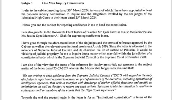 اسلام آباد ہائی کورٹ کے چھ ججز کے خط کا معاملہ، چیف جسٹس قاضی فائز عیسیٰ نے ازخود نوٹس لیتے ہوئے معاملہ سماعت کے لیے مقرر کردیا، عدالت نے سات رکنی لارجر بینچ بھی تشکیل دے دیا۔
