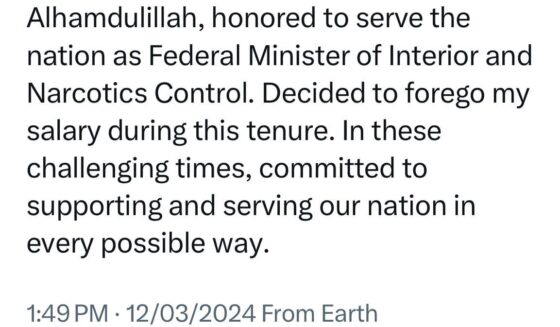 وفاقی وزیر داخلہ و انسداد منشیات محسن نقوی کا ٹوئیٹ؛ الحمدللہ، وفاقی وزیر داخلہ و انسداد منشیات کی حیثیت سے قوم کی خدمت کرنے کا اعزاز حاصل ہواہے، اس مدت کے دوران تنخواہ نہ لینے کا فیصلہ کیا ہے، اس…