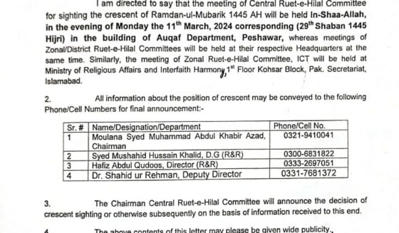 رمضان المبارک 1445 ہجری کے چاند کی رویت کیلئے مرکزی اجلاس سوموار 11 مارچ بمطابق 29 شعبان بعد نماز عصر پشاور میں منعقد ہو گا۔