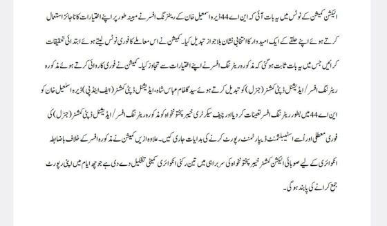 انتخابی نشان ناجائز طریقے سے بدلنے پر ڈیرہ اسماعیل خان کے ریٹرننگ افسر کو نشان عبرت بنادیا گیا فوری نوٹس لیتے ہوئے ابتدائی تحقیقات الزام ثابت ہو گیا فوری معطلی اور 6 دن میں تحقیقات کا حکم
