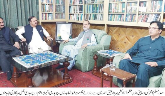 راولپنڈی صدرمسلم کانفرنس و سابق وزیراعظم آزادکشمیر سردار عتیق احمد خان سے مجاہد منزل میں وزرائےحکومت عبدالماجد خان،چوہدری اکبر ابراہیم اور چوہدری اکمل سرگالہ آزادکشمیر کی تازہ صورتحال پر ملاقات کررہے ہیں۔ راولپنڈی آل جموں وکشمیر مسلم کانفرنس کے صدر…